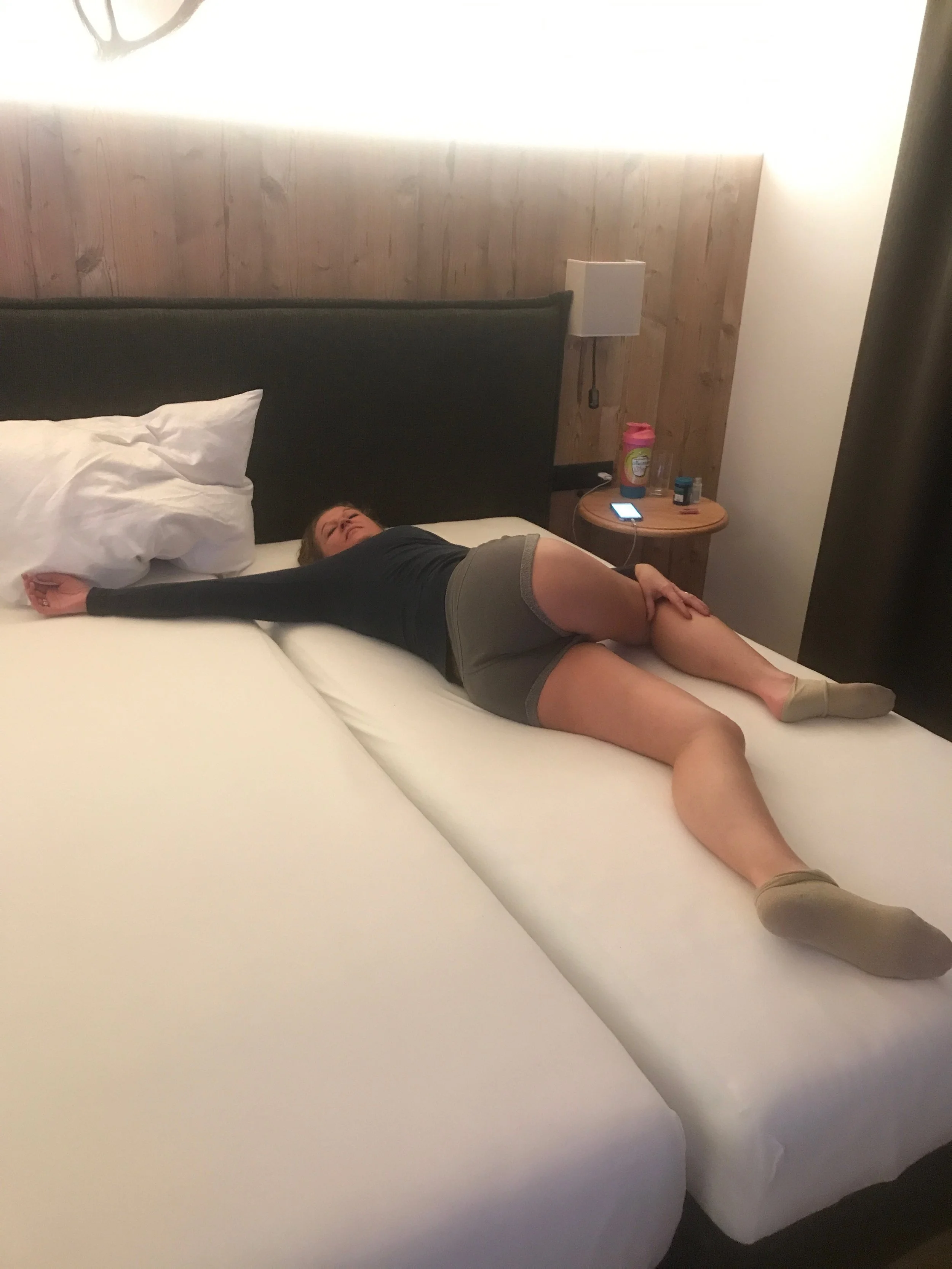 Reclined spinal twist: Bring your R knee close to your chest and drop it to the L, turn your head to the R. Repeat on the other side.