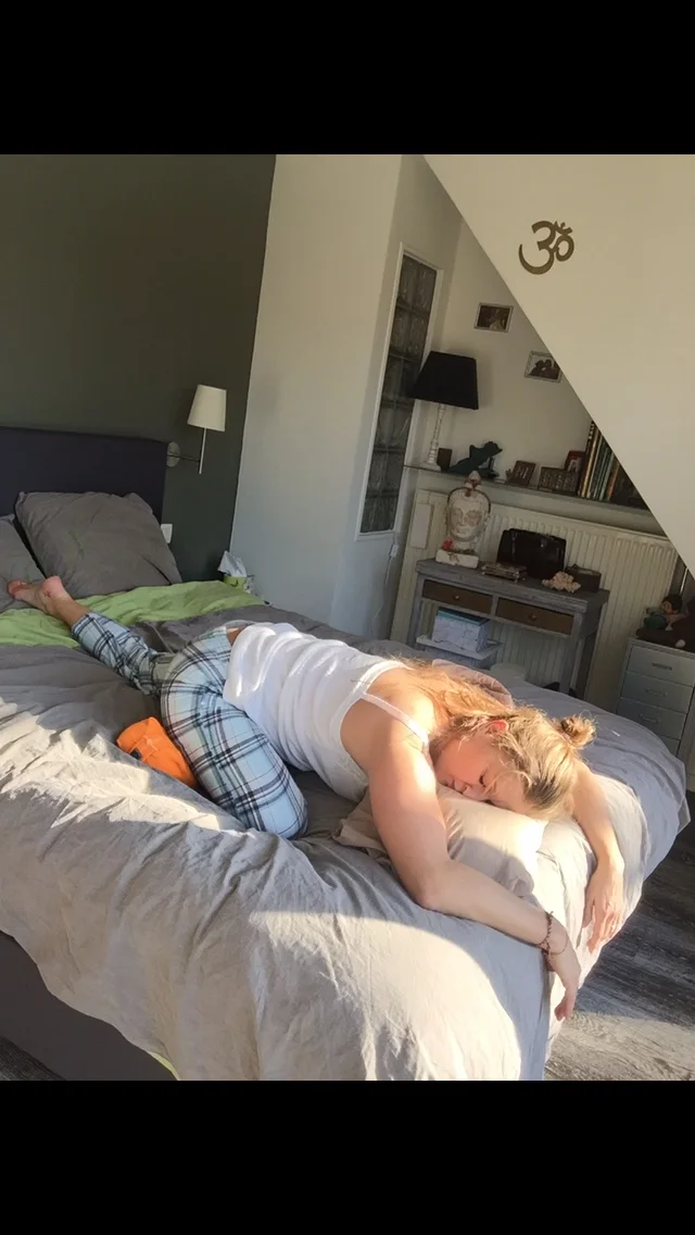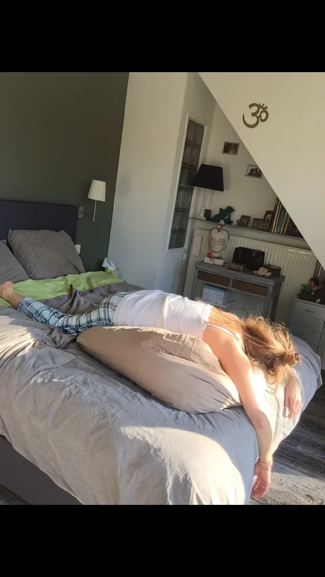Fish pose: bring your elbows, as close as you can, under your body. Push your elbows in your bed to open your heart en your shoulders.